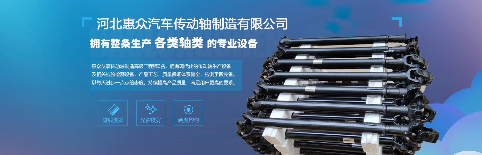 河北惠眾汽車傳動軸制造有限公司由原晨光機械有限公司(創始于1987年)轉制而來,坐落在歷史悠久的中山古都--河北定州市,京廣鐵路、京珠高速、貫穿南北的107國道穿市而過,朔黃鐵路在此交匯。惠眾公司位于107國道旁,距火車站3公里,京珠高速4公里,石家莊機場40公里,交通便利、地理位置優越,是一家專業生產、制造、銷售傳動軸的股份制企業。